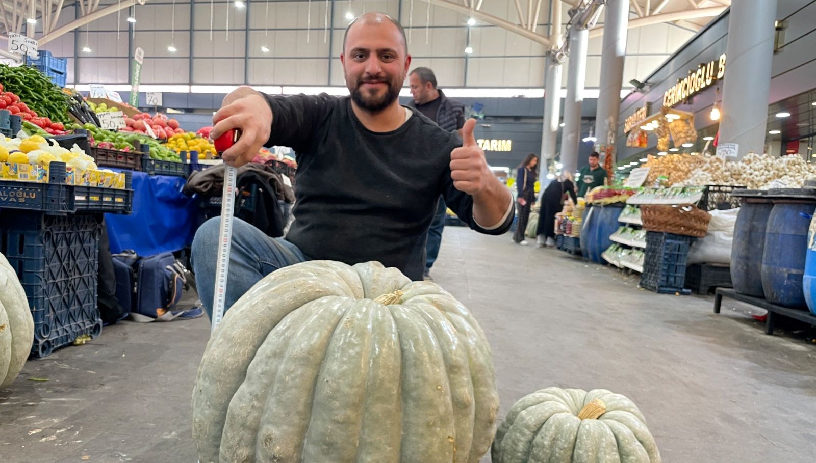 Sivas’ta bir çiftçi, bahçesinde devasa bir bal kabağı yetiştirdi. Bal kabağını satmak için tezgahına getiren esnaf Ferhat Çobanoğlu, gözlerine inanamadı.